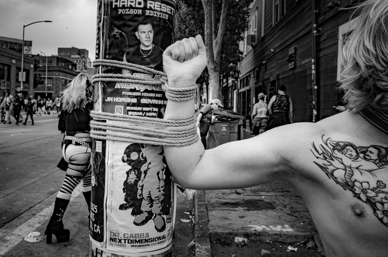 This isn’t just photography; it’s a reckless dive into the mad, leather-clad underbelly of San Francisco. The Folsom Street Fair is not for the faint of heart or the prudish voyeur. It’s a last bastion of unbridled human expression, where bondage and discipline meet the California sun in a sweaty handshake. Among this circus of whips, chains, masks, and raw energy, I prowl, not for shock value, but for the peculiar, the unexpected, the flashes of humanity hiding in the carnival of chaos.